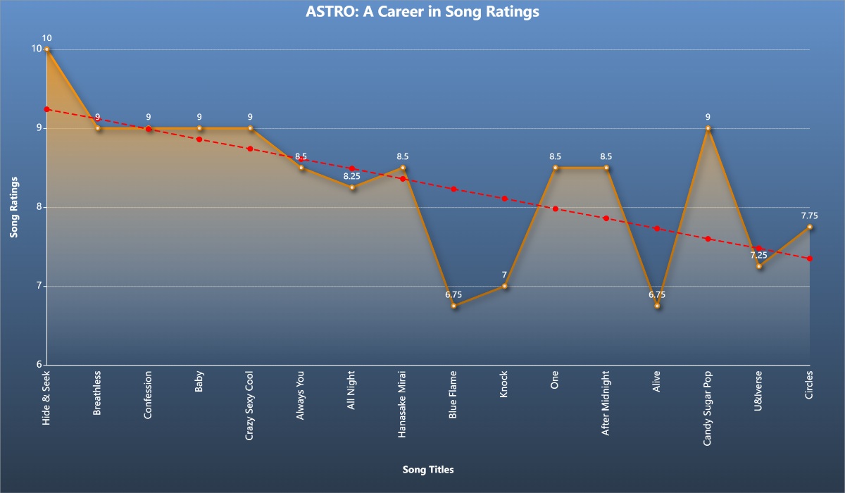 There are a number of acts who have debuted in the past few decades and have dozens of song ratings on this blog. I thought it would be fun to lay these ratings out in chronological order, line-graph style, and take a macro view of their careers so far. Then, similar to my “Underrated K-pop” features, I can average their ratings into one mega-score and place them in a pantheon alongside other acts.
