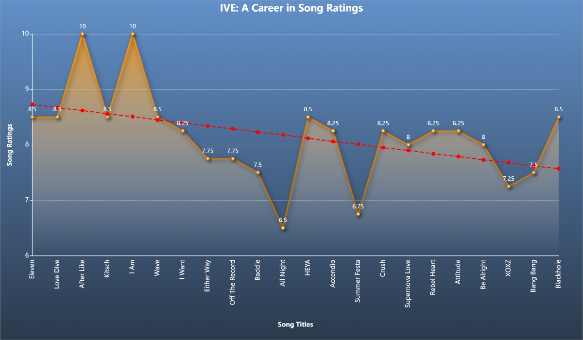 Oof, japanese songs and ad songs beside, almost every track is over an 8.5 for me, if not an 8. There’s this weird thing with IVE where upon release, I get very disapointed and then not even weeks later, the song becomes a masterpiece to my ears.
