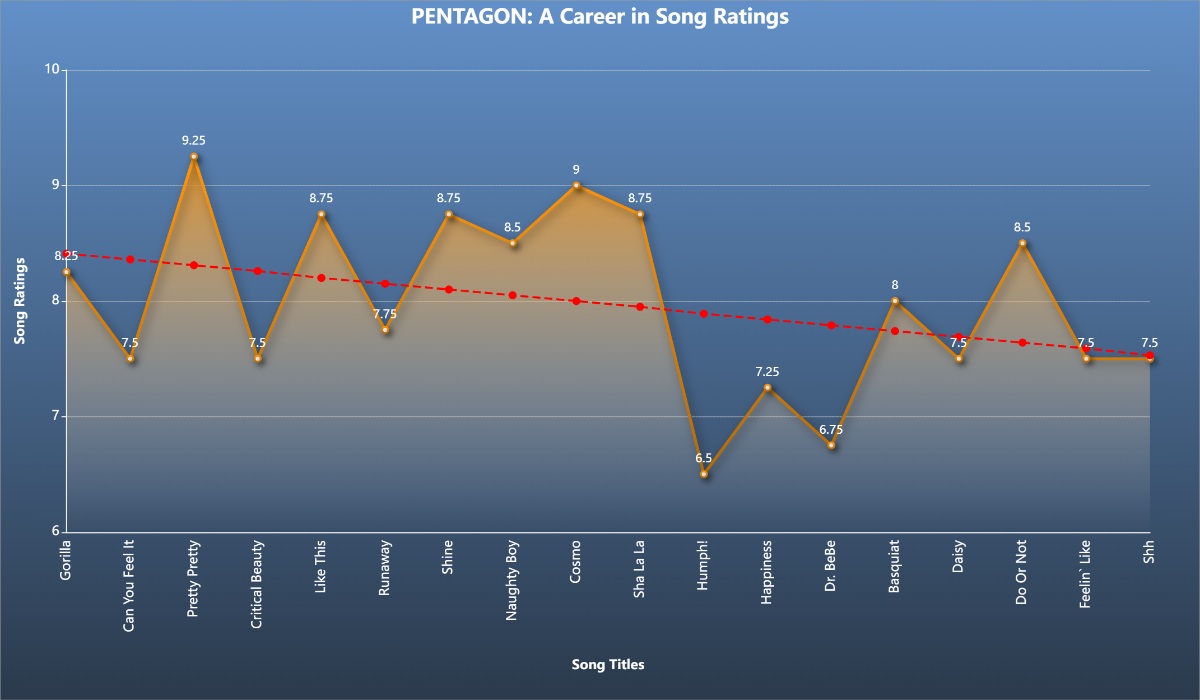 There are a number of acts who have debuted in the past few decades and have dozens of song ratings on this blog. I thought it would be fun to lay these ratings out in chronological order, line-graph style, and take a macro view of their careers so far. Then, similar to my “Underrated K-pop” features, I can average their ratings into one mega-score and place them in a pantheon alongside other acts.