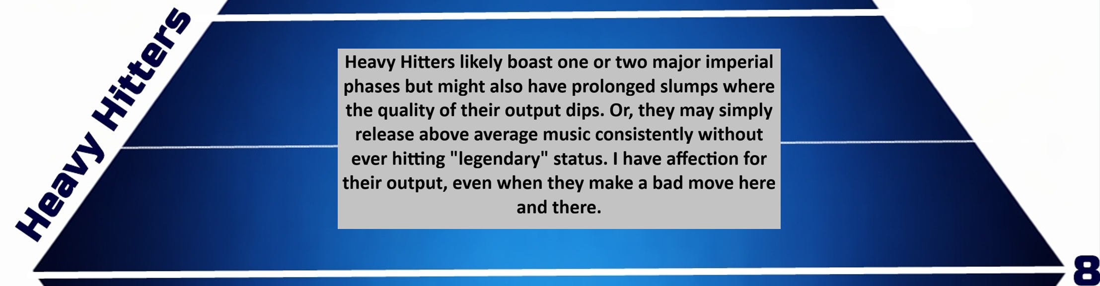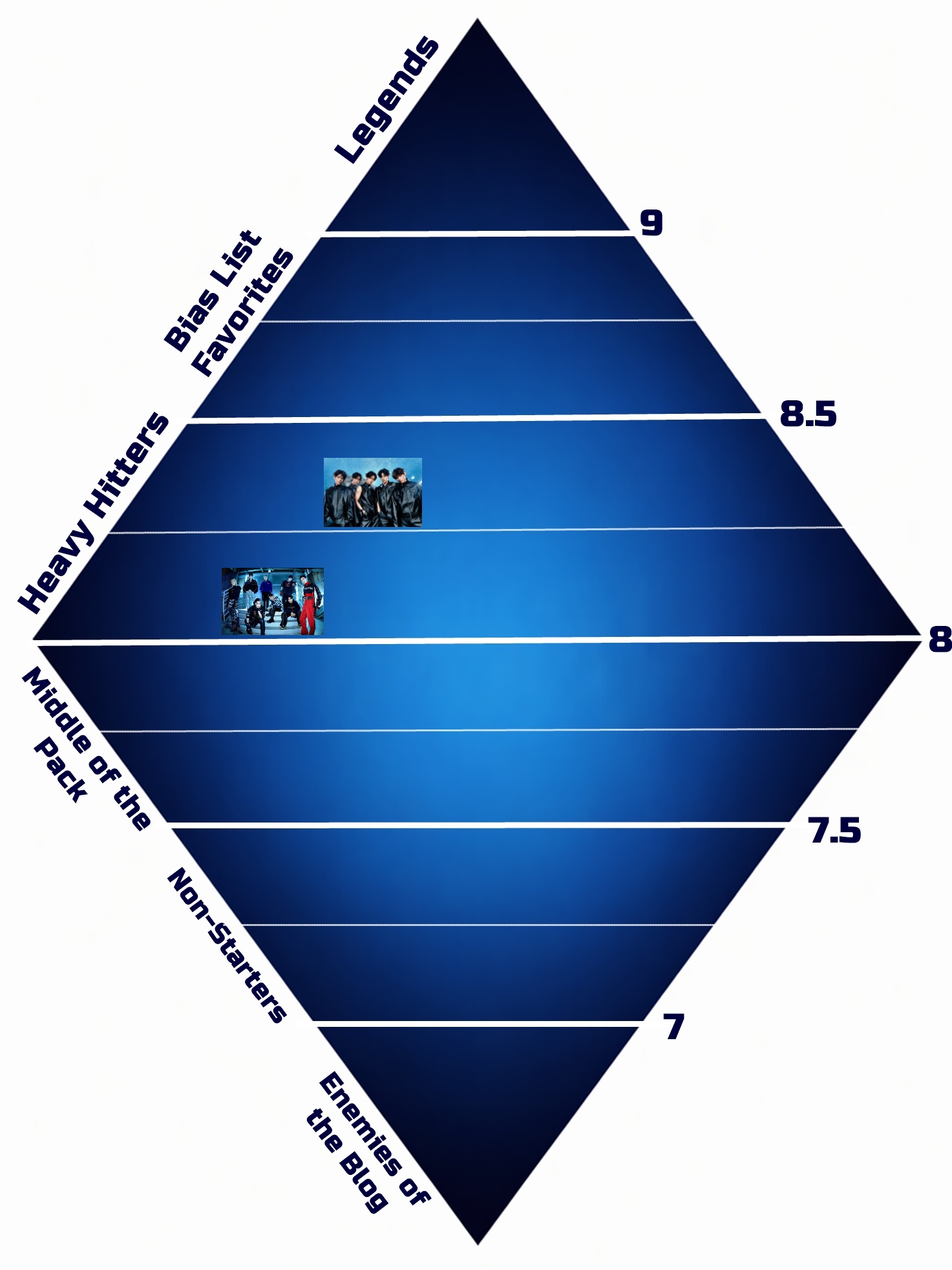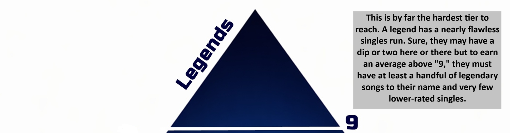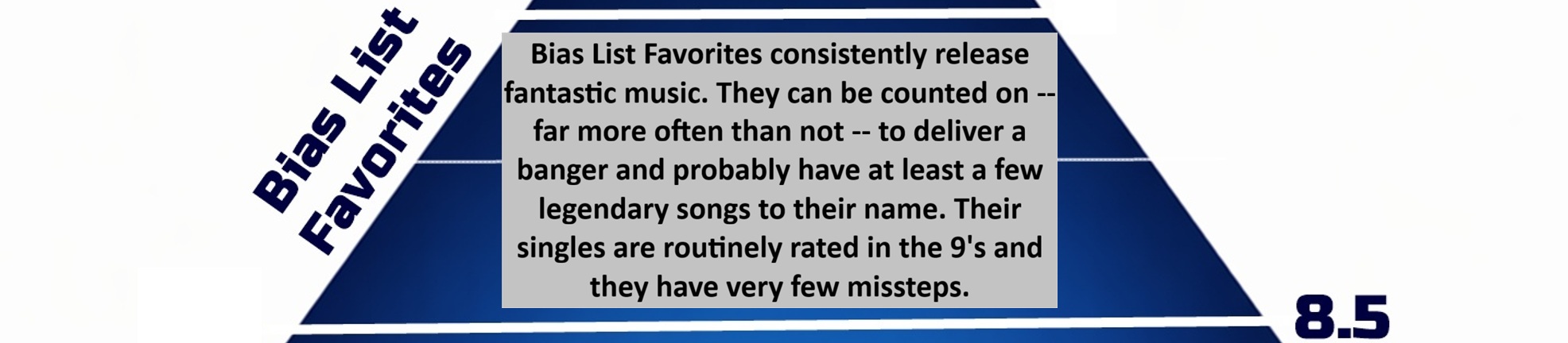 Below, you’ll find the ever-growing roster of acts who have been featured in my “A Career in Song Ratings” feature. Each act is given an average rating and sorted into THE BIAS LIST’s ultimate ranking, of which there are five tiers. Scroll past the main graphic to see an explanation of each tier and the artists who fall within it!